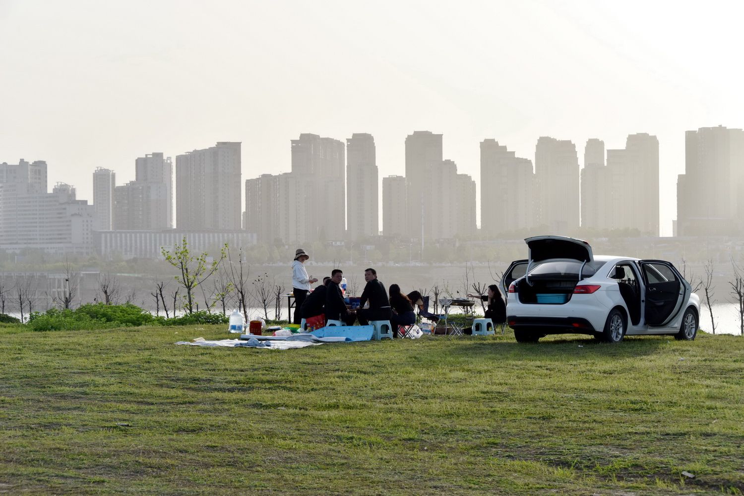4月8日,市民在汉江边亲水旅游