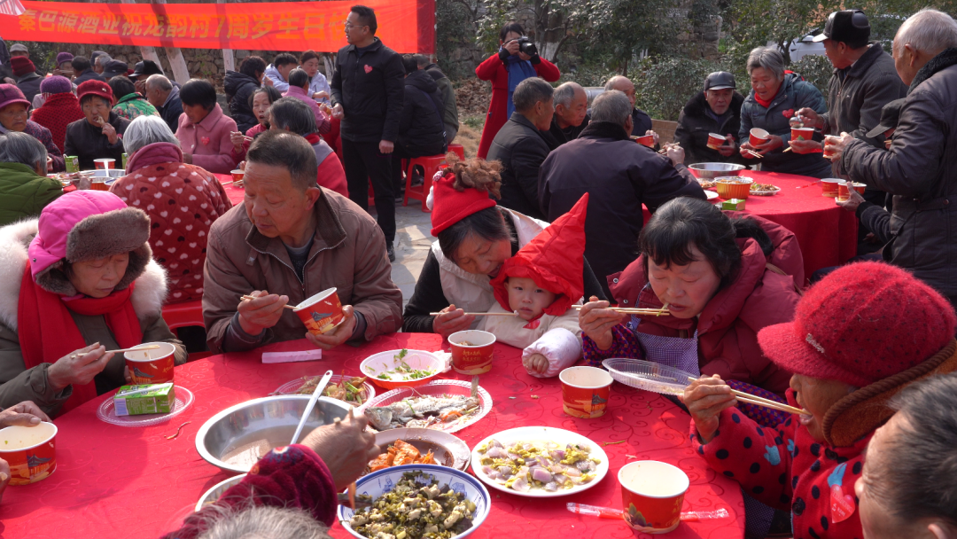中午时分,在龙韵村村落文化记忆街,几十张桌子排成长龙,全村300多名60岁以上老人齐聚一堂。随着一盘盘具有乡土特色的菜肴上桌,大家一同品尝美味菜肴,共享发展成果,现场洋溢着浓浓的新年氛围。