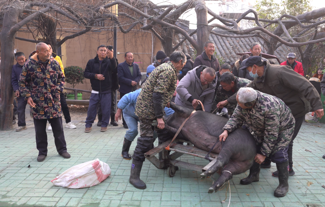 工作人员忙着宰杀年猪,为中午的宴席做准备,现杀现做的新鲜为餐桌增添了期待与美味。
