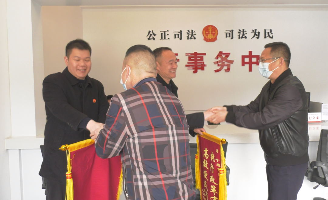 日前,两工程建设公司负责人带着锦旗来到郧阳区人民法院执行局,向法官表示感谢。