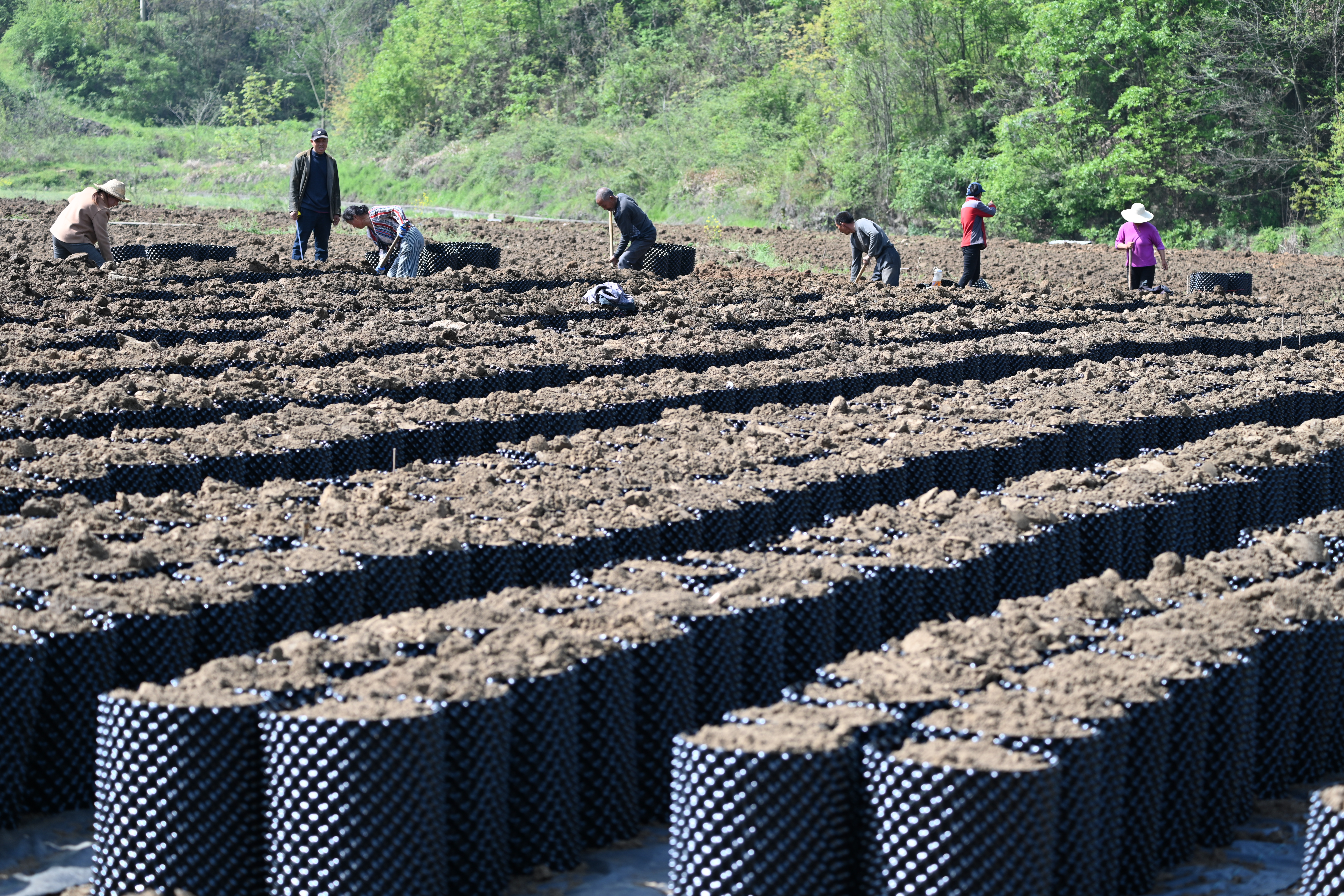 4月10日,郧阳区谭家湾镇黄畈村农民在地里为村中药材种植合作社制作大营养钵,用于种植中药材。黄畈村建立联农带农机制,联合农户成立中药材种植合作社,发展成为远近闻名的中药材种植专业村。
