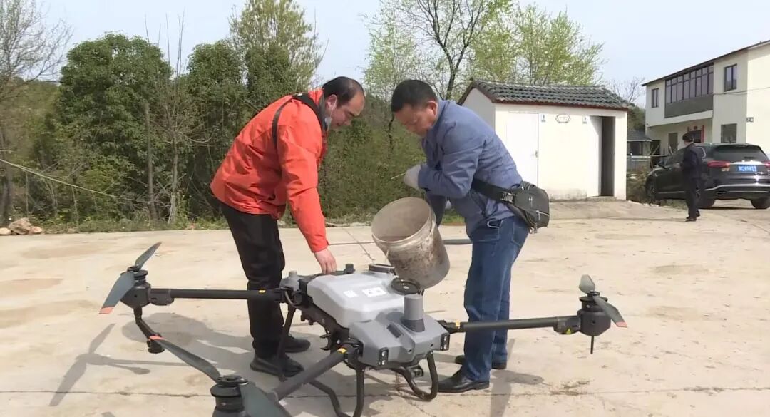 植保工作人 郭青涛介绍说,像今天喷洒的这一面山,如果用人工背的喷雾器喷洒的话,10多个人要喷洒一个多星期,用无人机的话两个人半天就能喷洒完。