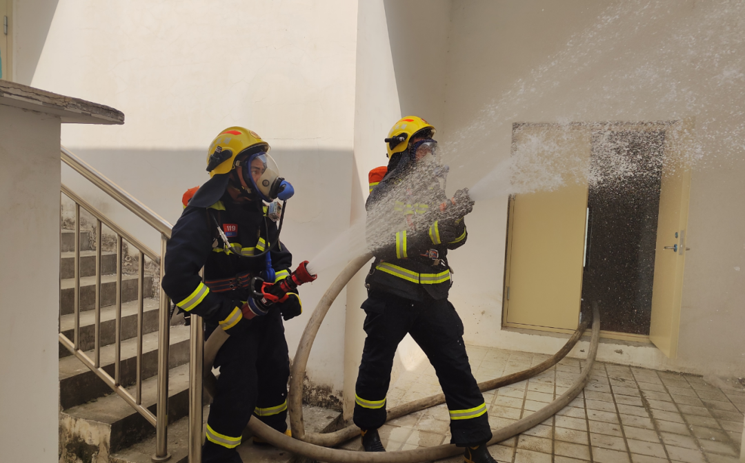 警戒组在现场设置警戒区、有序疏散群众;灭火战斗组组织内攻灭火、火场排烟、举高喷射、供水保障、安全监测等工作,“火灾”被成功扑灭。