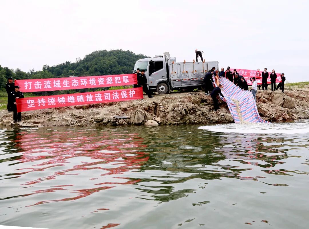 5月25日,郧阳区人民法院就胡某某犯非法捕捞水产品罪,在非法捕捞水产品的青山镇烟灯岭水域执行胡某某放流5-10cm鲢鱼鱼苗(100尾/公斤) 225668尾。郧阳区人民检察院、青山镇人民政府、区水利湖泊局、区农业农村局现场见证执行。