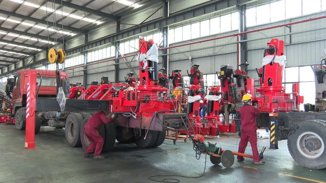 日前,在佳恒科技全资子公司——湖北杜德起重机械有限公司装配车间内,工人正紧张有序地进行随车吊组装与底盘改装作业。