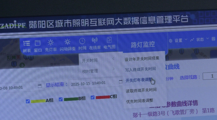 从“灭灯”到“亮灯”,快的不只是维修速度,更是背后的智慧升级。如今在郧阳,智慧路灯控制系统成了“千里眼”与“指挥家”。“不仅能远程控制开关、给灯光编程,还能实时监控功率,一旦有异常立刻告警,我们能快速定位故障原因。”职工易龙祥指着系统屏幕介绍。