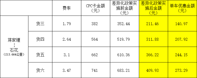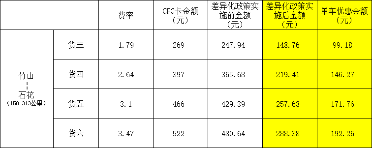 优惠对象:连续行驶上述路段100公里以上安装并正常使用ETC的3-6类货车(总轴数3-6轴,含专项作业车),且在优惠路段收费站驶入和驶出(包括石花、大薤山、寺坪、青峰、房县、军店、窑准、竹山、宝丰、竹溪、蒋家堰,共计11个收费站)。