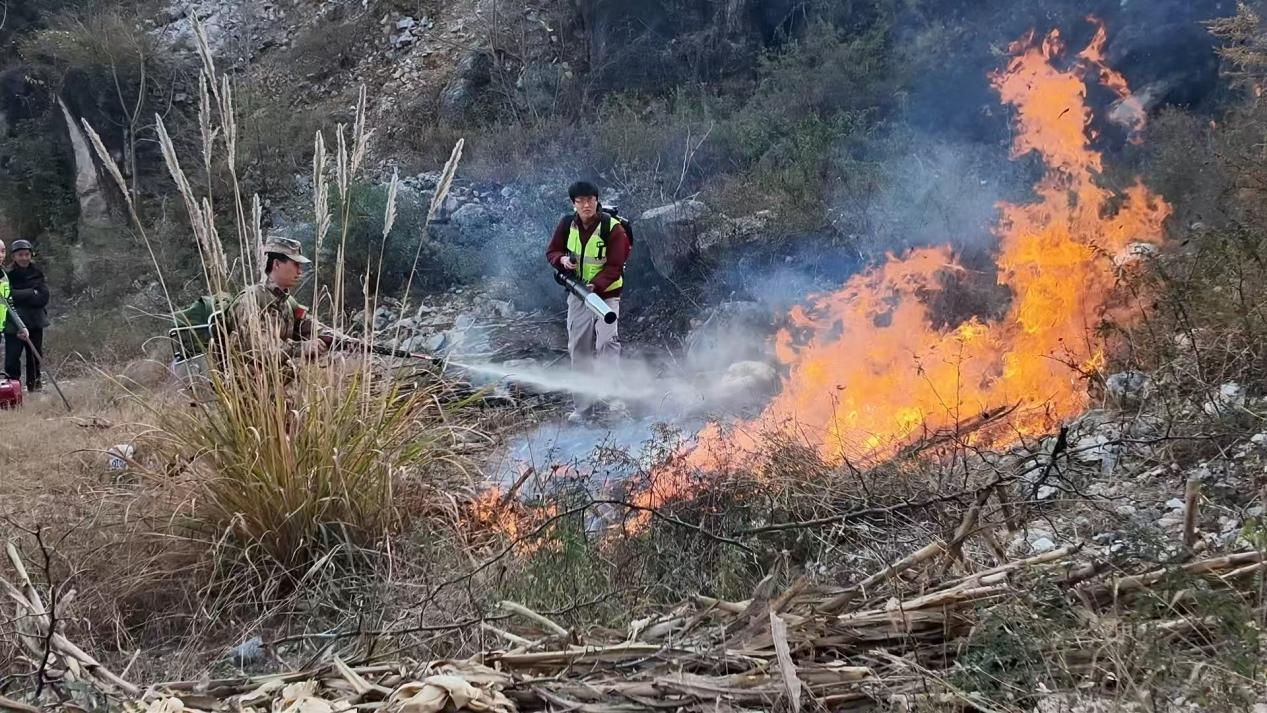 此次演练以突发山火为模拟场景,完整覆盖火情上报、人员集结、装备使用、山火扑救、余火清理、现场撤离等全流程。演练现场,参演人员操作风力灭火机、高压细水雾灭火水枪及打火扫把,分工明确、配合紧密,规范完成各项处置环节,仅用十余分钟就完成了模拟火场的扑救工作,达到了预期效果。