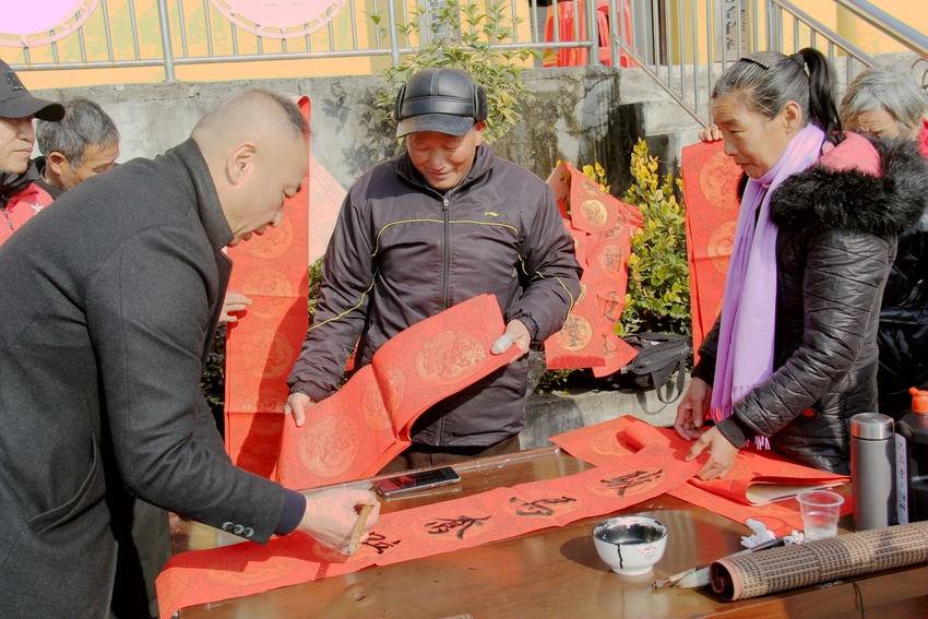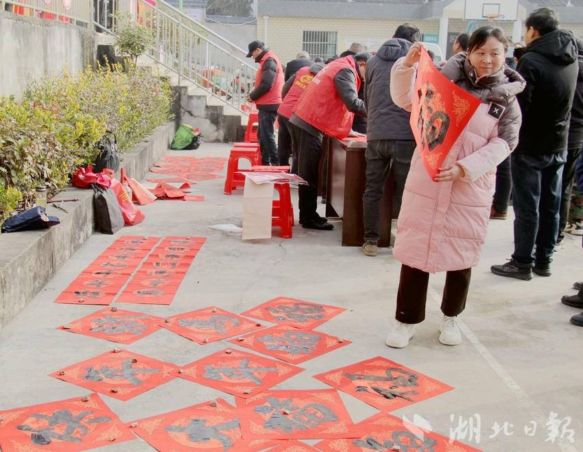 广场北侧,大红对联纸在晨光中鲜亮夺目。区政协委员朱文与书法家们挥毫泼墨,“路通业旺家和睦,岁稔年丰人安康”等春联跃然纸上,墨香先于年味弥漫山乡。47岁的郭存宝夫妇等候多时,他们的酿酒坊在政协驻村干部助力下,2025年收入突破17万元。“手写春联有魂,就像政协帮修的路、兴的产业一样,心里踏实!”接过定制春联,郭存宝笑意盈盈。孩子们踮脚围观,在掌心描摹“福”字,笑声混着墨香飘出年的味道。