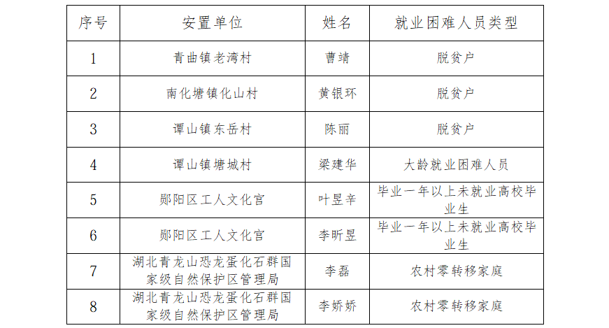 根据《省财政厅、省人力资源和社会保障厅关于印发<湖北省就业创业资金管理办法>的通知》(鄂财社〔2024〕88号)、《省人力资源和社会保障厅、省财政厅关于进一步做好公益性岗位开发管理有关工作的通知》(鄂人社发〔2020〕52号)文件精神,现将3月公益性岗位拟聘用人员相关情况予以公示,接受社会监督。