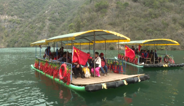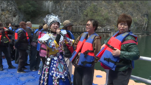 景区里,由当地群众自发组织的郧阳民俗节目《划旱船》表演热闹开场,喜庆的装扮、生动的表演吸引了众多游客驻足观看,大家纷纷上前拍照打卡、互动体验。与此同时,景区内推出山歌对唱,悠扬的山歌回荡在青山绿水间,让游客们的春日旅途充满了欢声笑语。十堰市民赵女士说,昨天二月二龙抬头,今天二月三日,又是星期六,带小孩出来踏踏春,看看风景,沾二月二的龙气。九龙瀑,风景挺好,空气也很新鲜,人也多蛮热闹的,心情也挺开心的。
